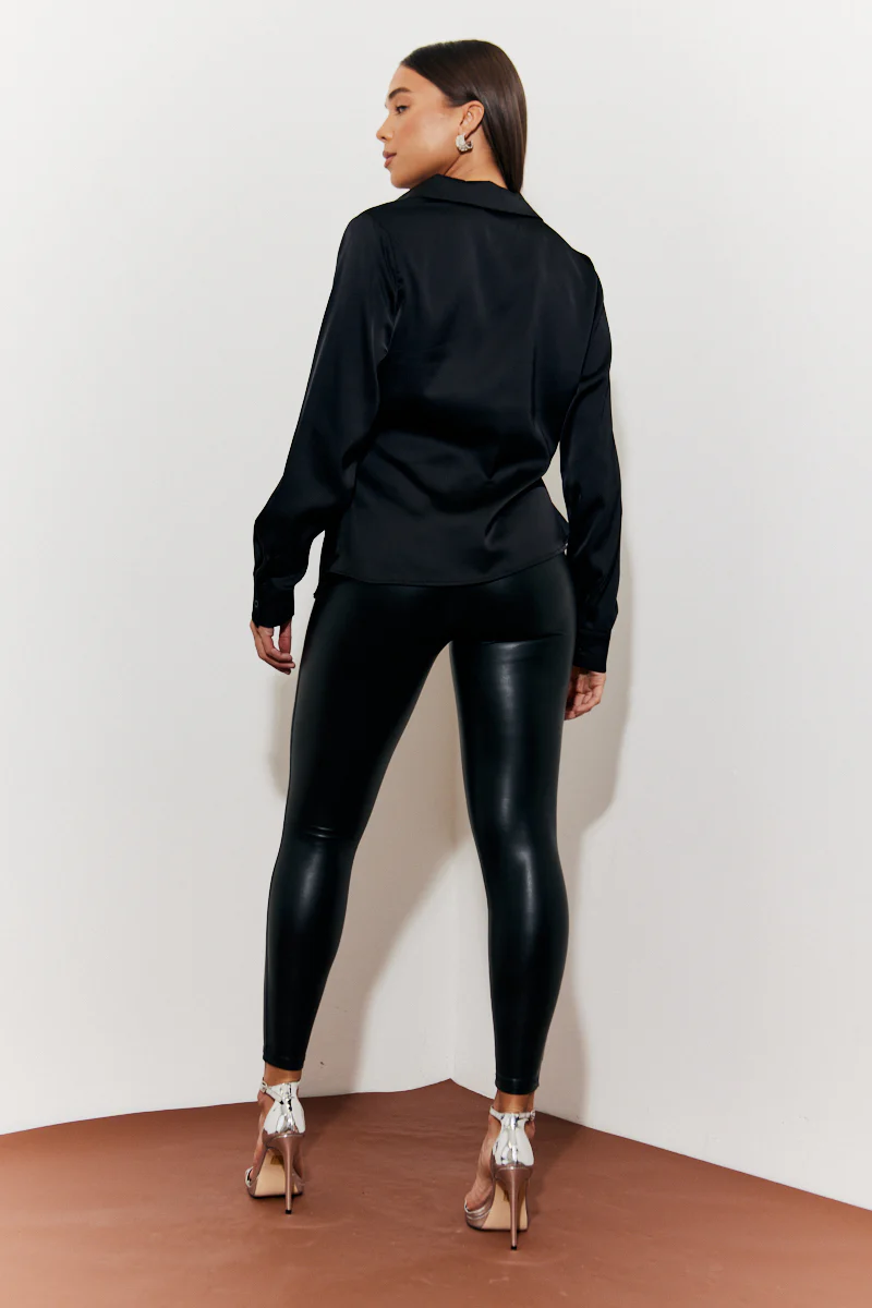 Our new asymmetric button detail satin shirt is your solution to the jeans and a nice top dilema. Perfect for adding a dressy touch to your look, team with your pu leggings or a skirt for a chic evening look.