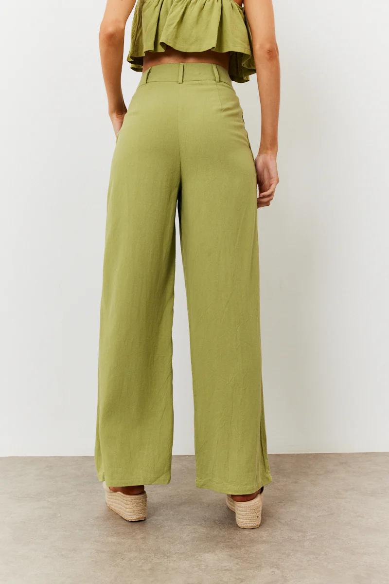 Top up your basics with our new green linen blend wide leg trousers. Dress up with a cute top and heel or wear casually with a tee and sandals.